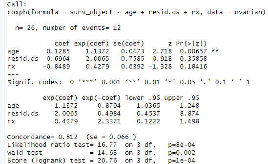cox_model <- coxph(surv_object ~ age + resid.ds + rx, data = ovarian)